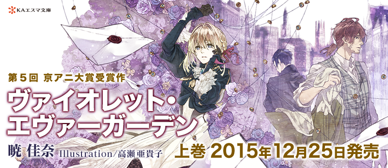 Tweet 第5回京アニ大賞受賞作『ヴァイオレット・エヴァーガーデン』の発売が決定いたしました! 上巻は2015年12月25日(金)発売! 京アニ&Doファン感謝イベント会場内にてポスターを掲示しておりますので、ご来場の方はぜひご覧ください!